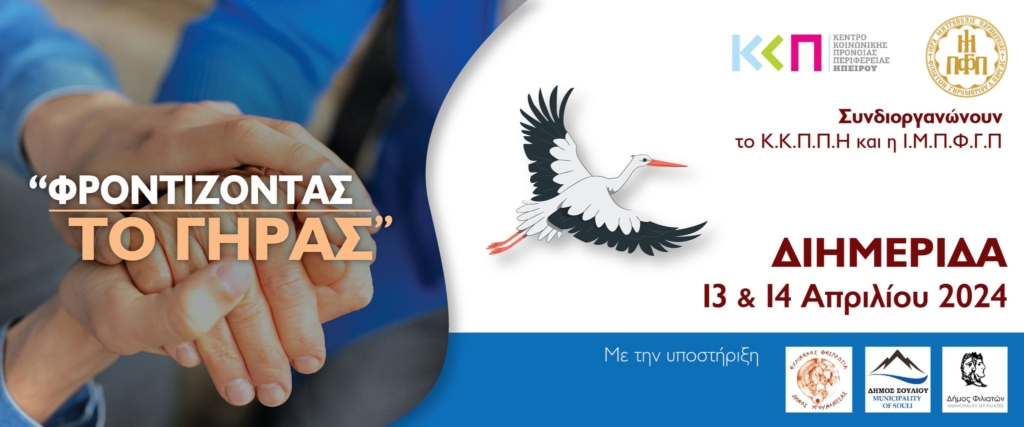 Το Κ.Κ.Π.Π.Ηπείρου σε συνεργασία με την Μητρόπολη Παραμυθίας, Φιλιατών, Γηρομερίου και Πάργας, διοργανώνουν το 1η Διημερίδα Γήρατος Ηπείρου στο Πολιτιστικό χώρο ΠΑΝΘΕΟΝ Ηγουμενίτσας με πλήθος διαλέξεων, στρογγυλών τραπεζιών, διαδικτυακών ομιλιών, με τη συμμετοχή αξιόλογων επιστημόνων και καταξιωμένων ιατρών διαφόρων ειδικοτήτων.Η χώρα µας είναι µία από τις πλέον γερασμένες χώρες της Δύσης µε τα άτομά άνω των 65 ετών να αποτελούν το 21,3% του πληθυσµού, ενώ λόγω και της χρόνιας υπογεννητικότητας, τα παιδιά έως 15 ετών αντιπροσωπεύουν μόλις το 14% του συνολικού πληθυσμού.Η θεματολογία της Διημερίδας θα υπερβεί κατά πολύ τα στενά όρια των Επιστημών Υγείας, στοχεύοντας στην ανάδειξη των θεµάτων της Ενεργού και Υγιούς Γήρανσης, την ενσωμάτωση της τεχνολογίας στην καθημερινή ζωή των ατόμων της τρίτης ηλικίας, τη βελτίωση της ποιότητας ζωής τους, τα δικαιώματά τους στην υγεία, την πρόνοια και την ισότιμή µεταχείριση, την ενίσχυση των φροντιστών και την αποτελεσματικότερη οργάνωση των Υπηρεσιών Υγείας και Πρόνοιας για ηλικιωμένους τόσο στις μονάδες, όσο και ατομικά.Σκοπός μας, η διημερίδα να γίνει θεσμός ενημέρωσης και αλληλεπίδρασης κοινού και ειδικών.