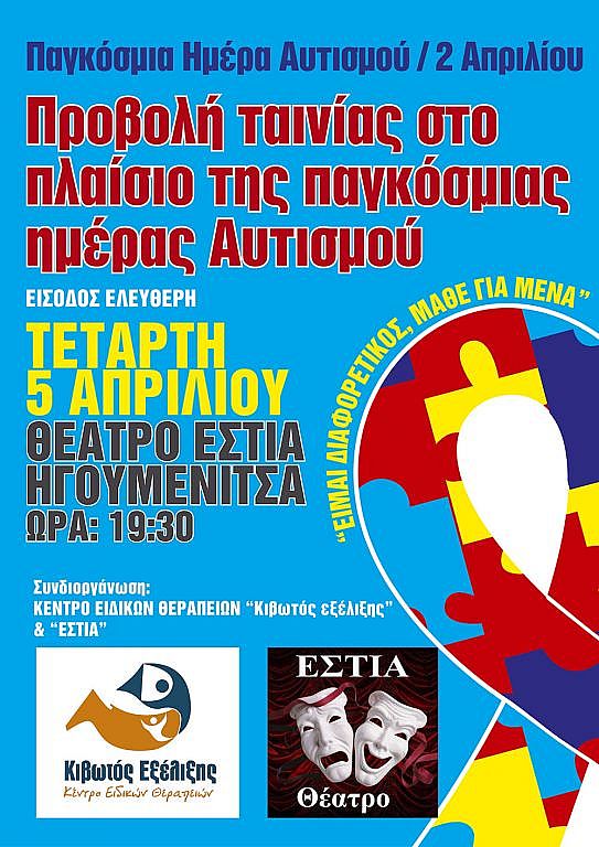 Το κέντρο ειδικών θεραπειών <<Κιβωτός Εξέλιξης>> και το θέατρο <<Εστία>>, συνδιοργανώνουν προβολή ταινίας με θέμα τον Αυτισμό, στα πλαίσια της παγκόσμιας ημέρας Αυτισμού, που ορίζεται η 02 Απριλίου. Ελάτε να γνωρίσουμε τι είναι ο Αυτισμός και το πώς θα βρεθούμε κοντά στις ικανότητες αυτών των παιδιών. Μια ταινία που θα σας συγκινήσει και θα δείξει το πως βιώνουν αυτά τα παιδιά την καθημερινότητα. Η προβολή γίνεται την Τετάρτη 05-04-2017 και ώρα 19:30, στο θέατρο Εστία που βρίσκεται στην 28ης Οκτωβρίου έναντι των Λυκείων στην Ηγουμενίτσα.